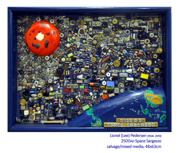 Lionel (Lee) Pedersen walked into Artsite Contemporary Galleries about four years ago and in one sense originated the idea of this exhibition. Lee was a back lane scavenger, a recycler of discarded things, and would often bring finds into the gallery for perusal before delivering to the Cat protection Society or local charity shops. Lees work is truly remarkable, imbued with a sense of humour and often produced in response to current events or articles he found in newspapers and television.