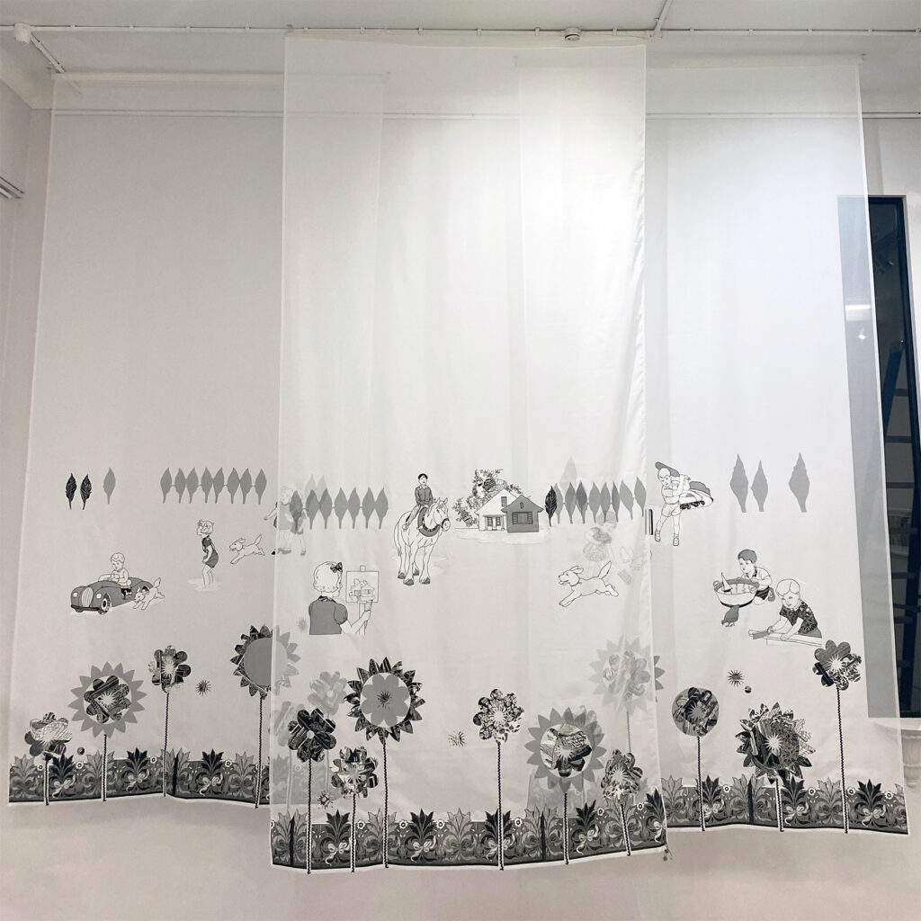 Sheer panels place appropriated images of children sourced from vintage colouring in books in an imagined Hazelhurst garden. Here the Broadhurst children play alongside the children we can see enjoying the playground of the Hazelhurst Art Centre of today.